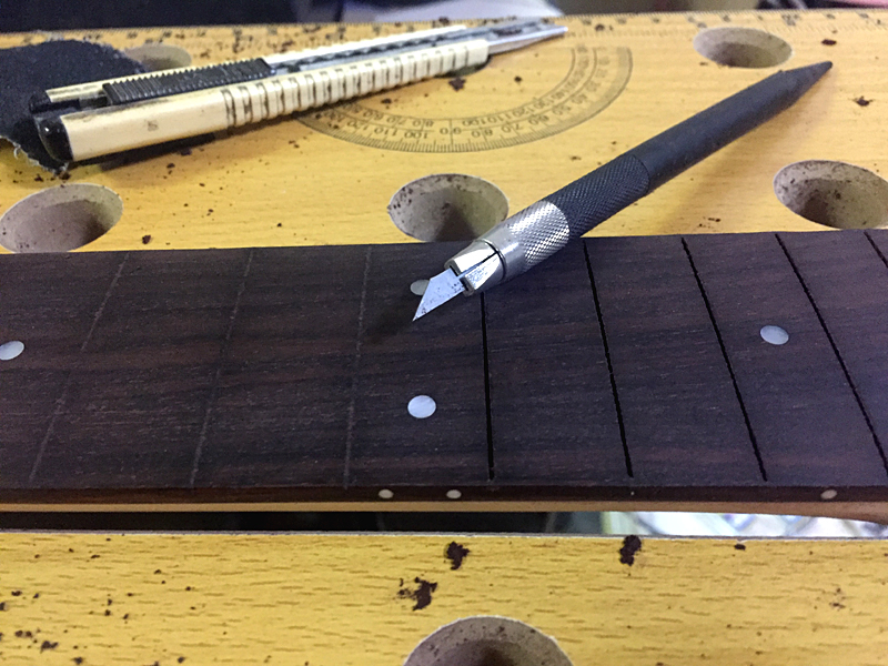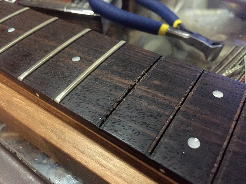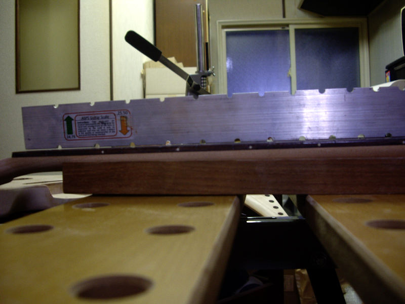 薄刃のノコギリ(フレットソーよりも更に薄いヤツ)を使って、フレット溝をさらってやったりもします。