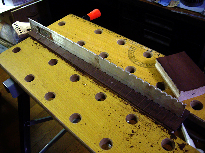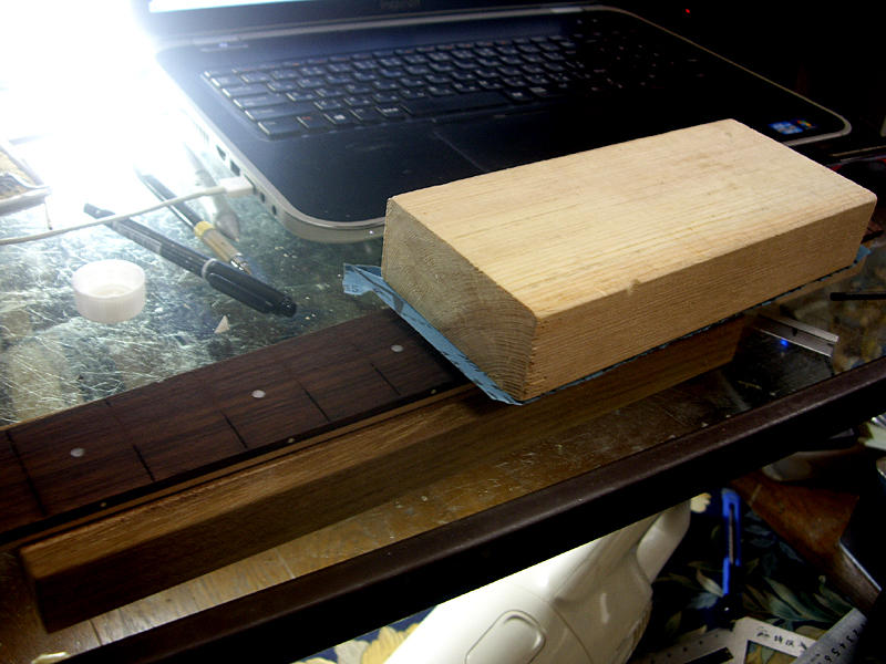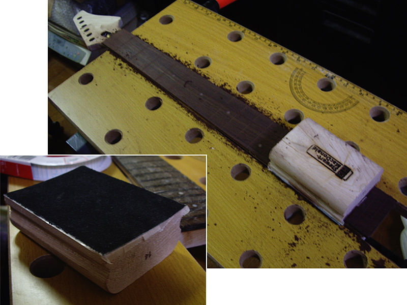 #120の紙ヤスリを貼り付けて、指板面のストレート出しをしているトコですな。
