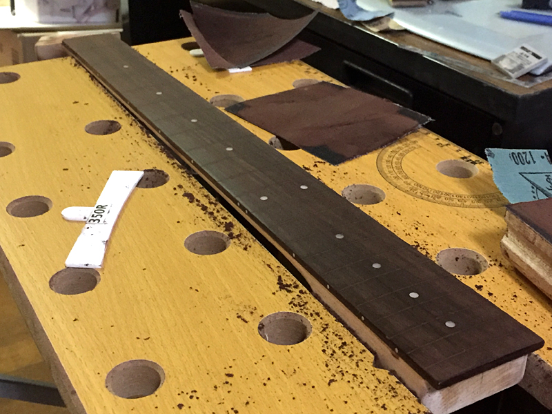 画像・中央:…で、最終的にフレットを打ち込む前には、キッチリと#1500程度まで磨き上げますが…