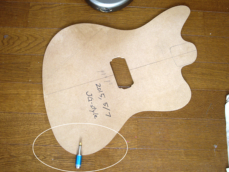 ジャガーやジャズマスター・スタイルのこのボディで、通常の位置にシールドジャックを設置すると、普通はこんな感じでシールドが付きますよね?