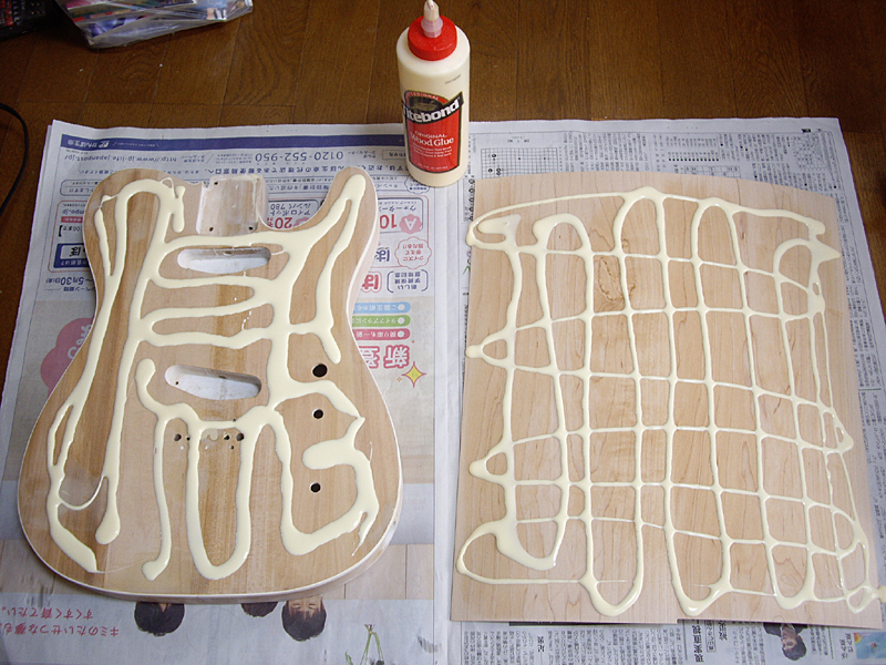 画像・中央:ボディと突板を貼り合わせる為、双方を濡れタオルで湿らせてからタイトボンドをどばぁーっとブッカケた状態ですw