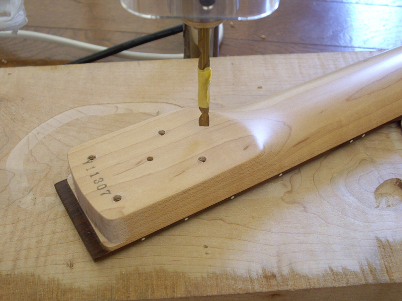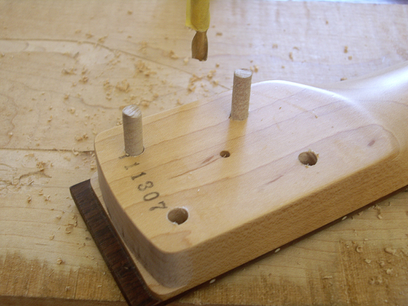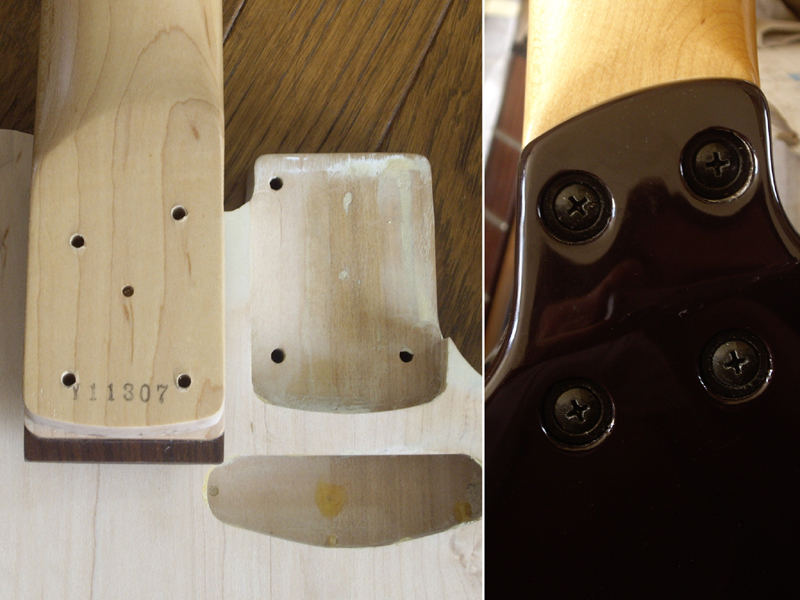 ネックの穴を一度埋めます。画像・右:元々開いていた