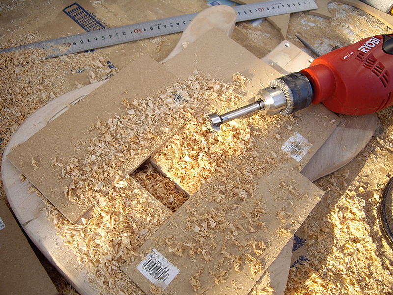 コントロール・キャビティ(P.U.セレクターやVol.&Toneポットが納まる部分です)の穴開けです。