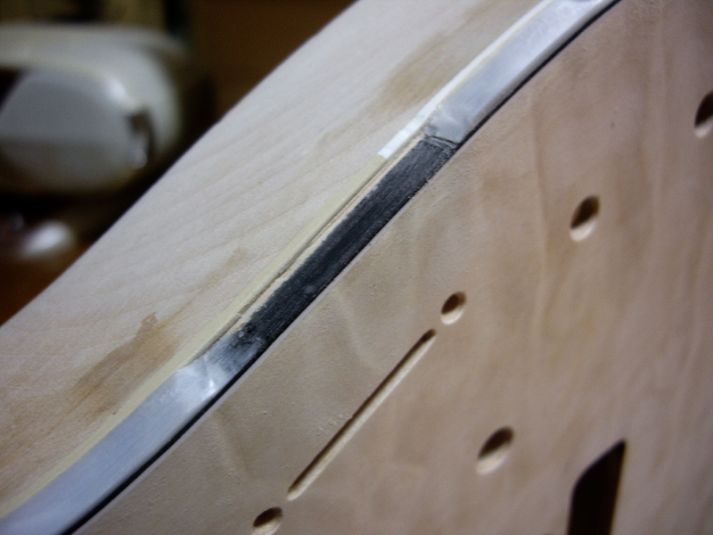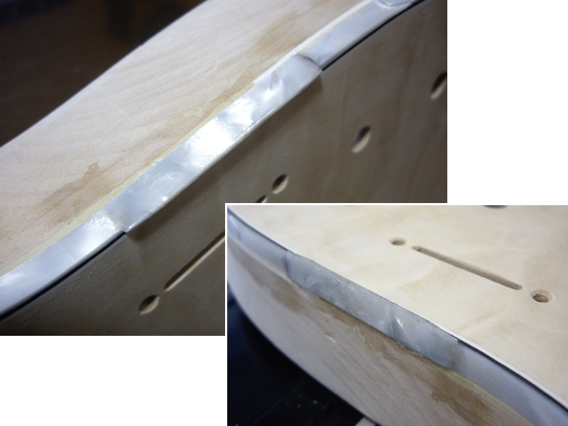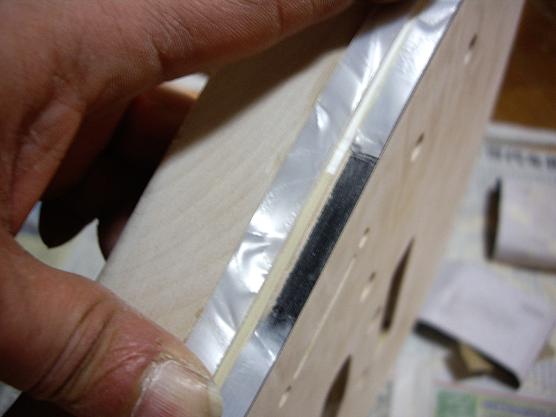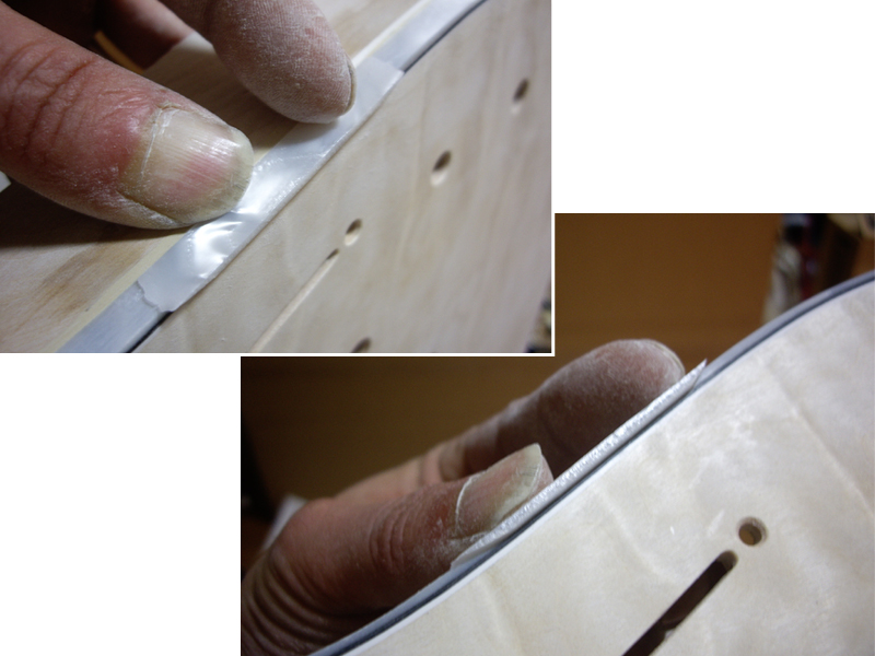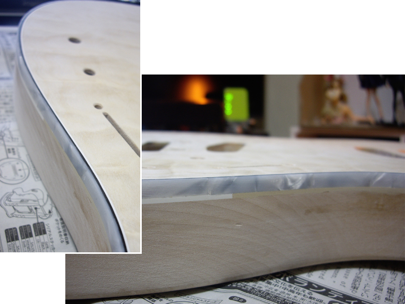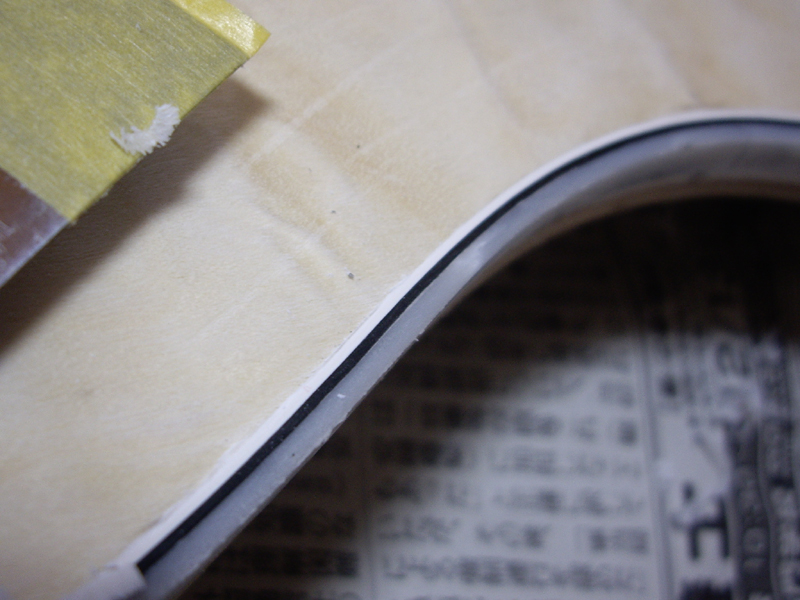 そこで…ちょいと邪道ですが…バインディング材は、接着剤のアセトンやシンナーで溶けてしまう…と言う性格を逆手に取り、主に接着面となる部分にシンナーをたっぷりと塗り付け、柔らかくした後、ボディ側の黒バインディングにアセトンを塗って接着してみました。はてさて、どぉなりますか。