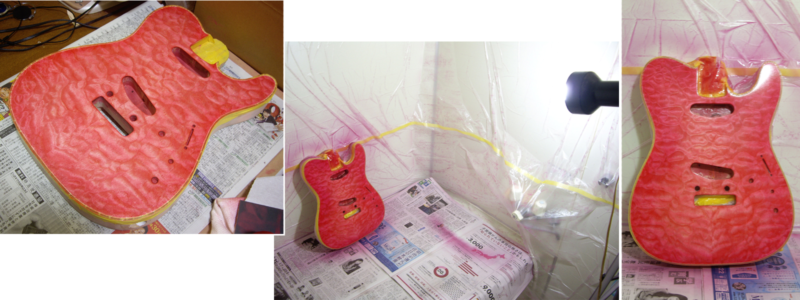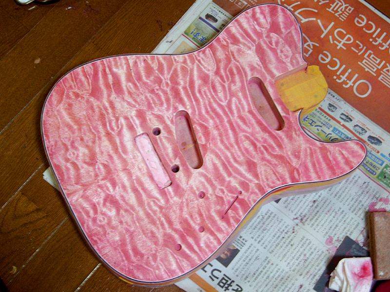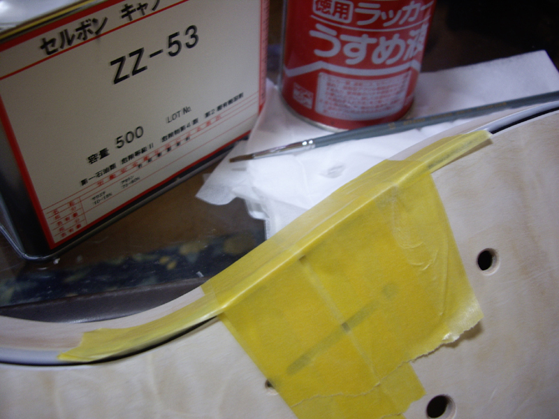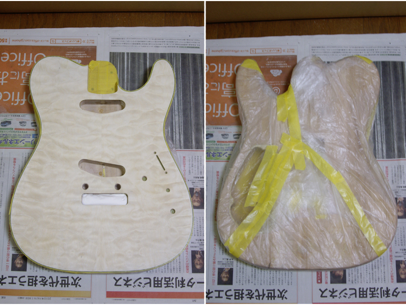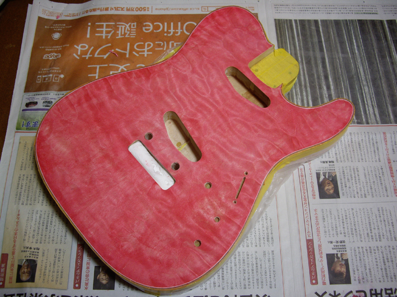 ただココで注意する事が一つ。イキナリ、スプレー塗装するならまだマシですが、木地染色をする際には、あまり気合入れて『ガシガシ』サンディングすると痛い目見ます。そぉ…サンディングした際の『削り線(ヘアライン状の傷)』が残ってしまうと、その傷にまでステインが入り込み、後々、その『線』が残ってしまう事になりますのでご注意を。そして後は、ボディ・バックにまで塗料が回らないように、バインディング部も含めてマスキングしておきます。