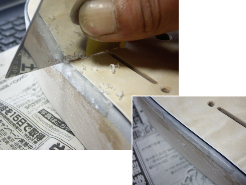 バインディングを巻いた後に、ボディ・トップやサイドにハミ出したバインディング材を削って、ボディ面と面一(ツライチ)にしてあげる訳ですな。コレをやらないと、当然の如く、完成度がガタ落ちしちゃいますし…