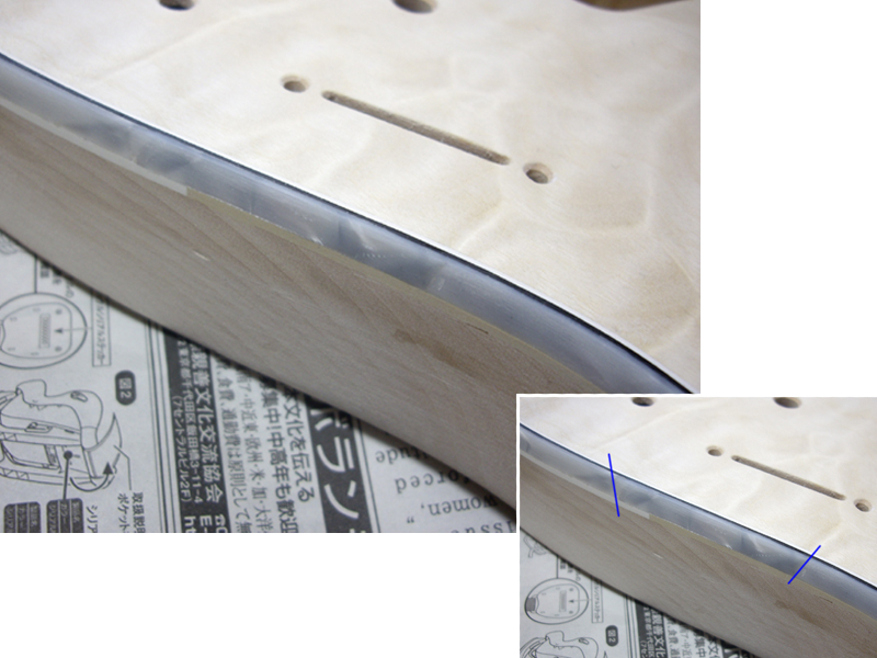 …と言う事で、白パール・バインディングのエグってしまった箇所の前後を、黒バインディングの深さまで、トリマーで削り落としました。画像・右:ココで、前回の