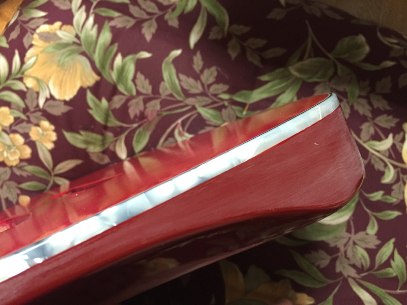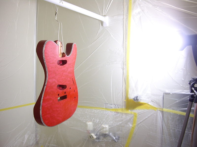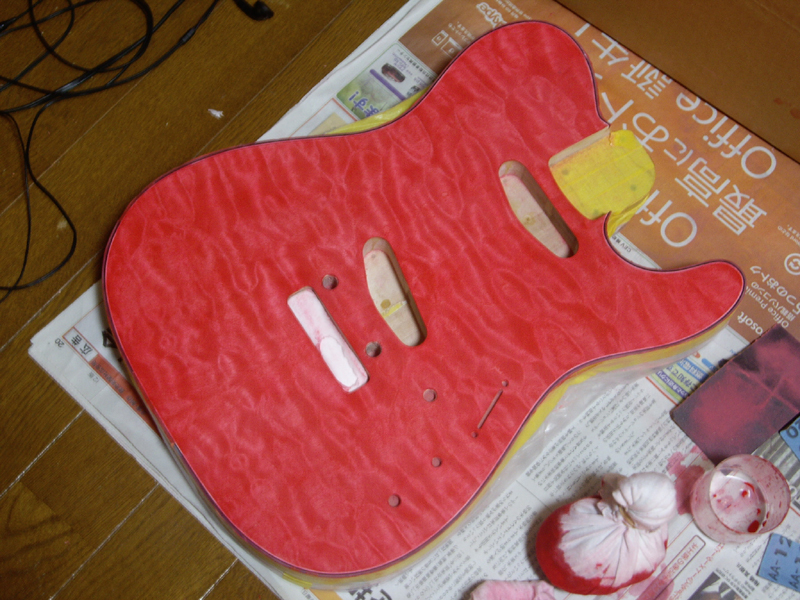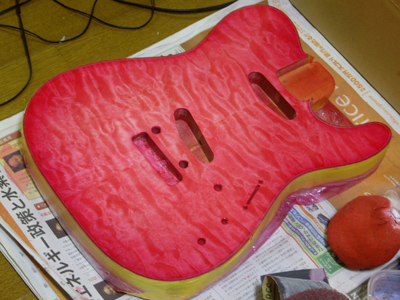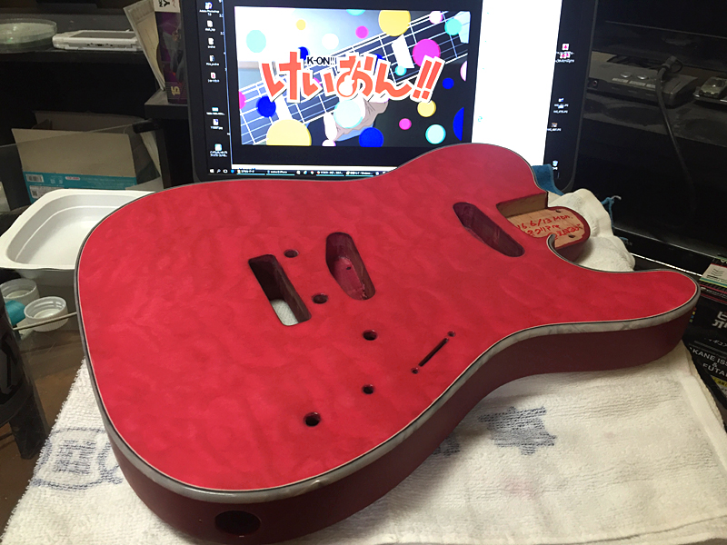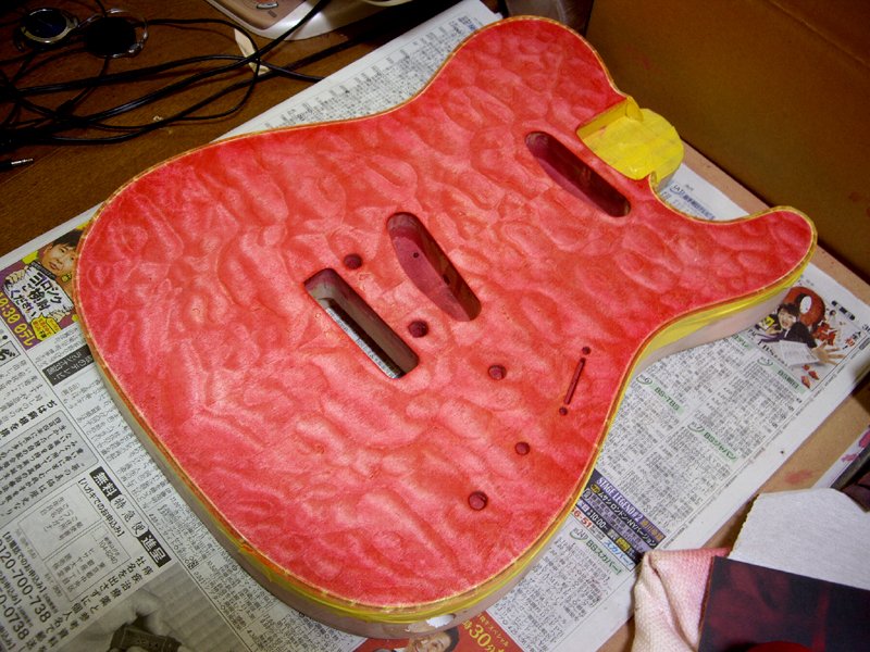 …で、ココからが更新が滞っていた間の作業になります。画像・左:これまでボディ・サイド&バックを覆っていたマスキングを外し、今度は、バインディング&ボディ・トップをマスキングした後に、サイド&バックの塗装工程に入っていきます。