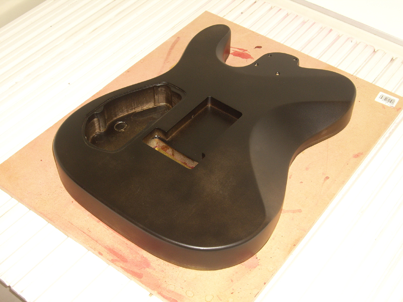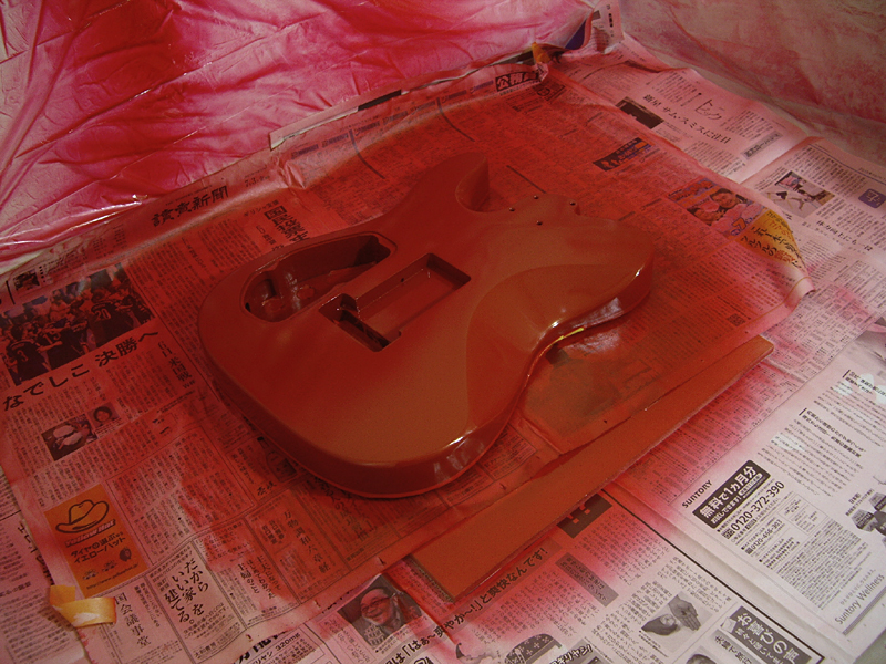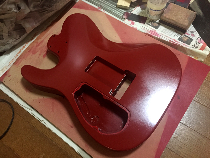 本来はボディを吊るして塗装するのですが、片面のみの塗装の為、横着して壁に立て掛けたりしながら塗り重ねていますw