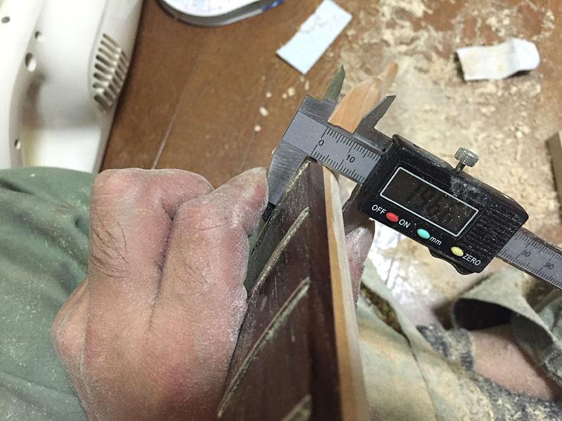 画像・中央:…で、瞬間接着剤も乾き…指板面の修正と直線出しをしているところですね。