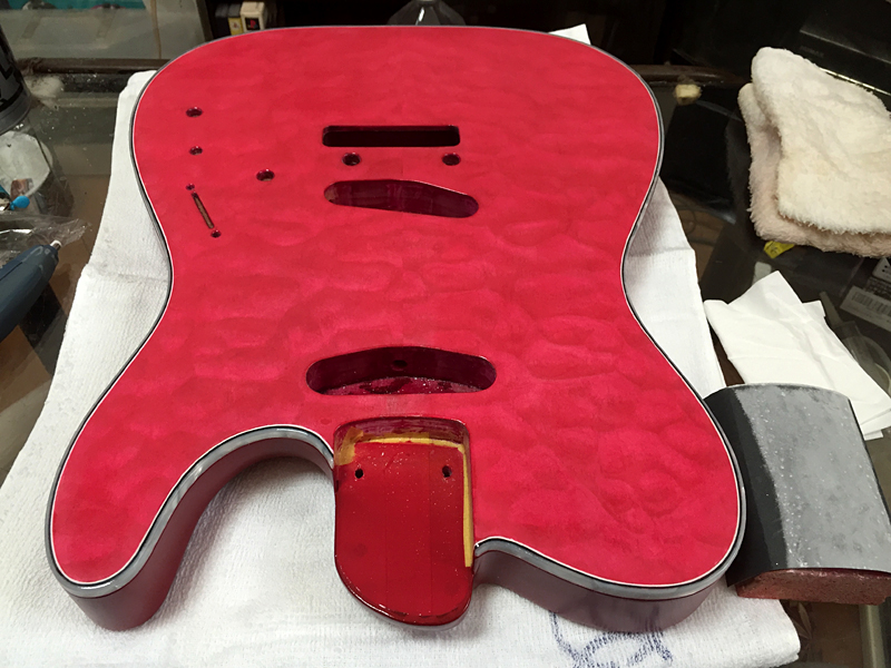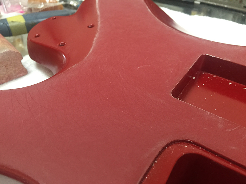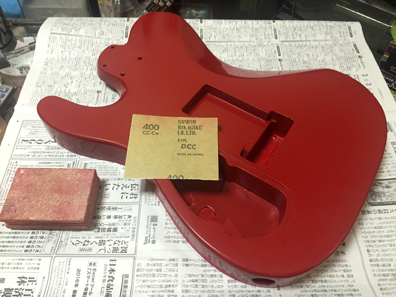 さて、数日間乾燥させていたボディ・バックの塗装も落ち着いたので…トップ・コートを吹くのに備えて、トップ&サイド&バック全ての表面を均していきます。
