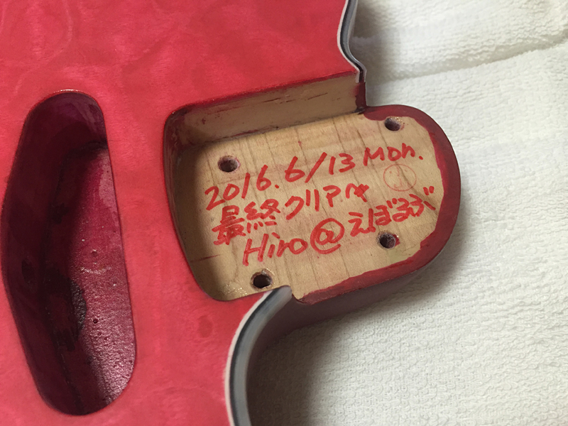 最終のトップ・コート吹きの前に、ちょっと変な気を起こして、擦っても消えないように、クリア吹きの前にネック・ポケットに油性ペンで、こんな