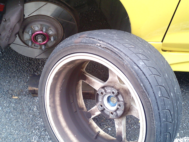Mも俺もキャンバーを+2〜2.5くらい付けてるンだけど、今回Mのバーストしたタイヤは、外側の溝はまだまだ深くて「ほとんど減ってないンじゃない?」って状態だったのに、内側はカーカスが出て来るくらいに減ってる………
